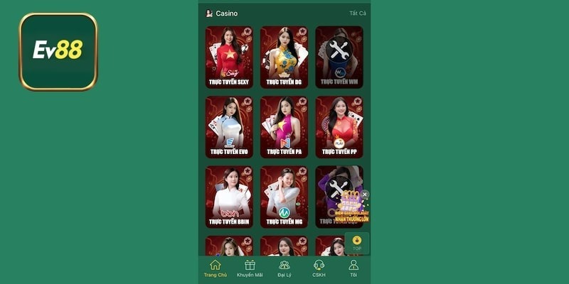 Sảnh Casino tại EV88 sử dụng dealer thật và đường truyền nhanh để tạo ra trải nghiệm không thua gì sòng bạc thực tế. Tất cả ván cược đều rõ ràng và minh bạch giúp người chơi yên tâm khi tham gia.